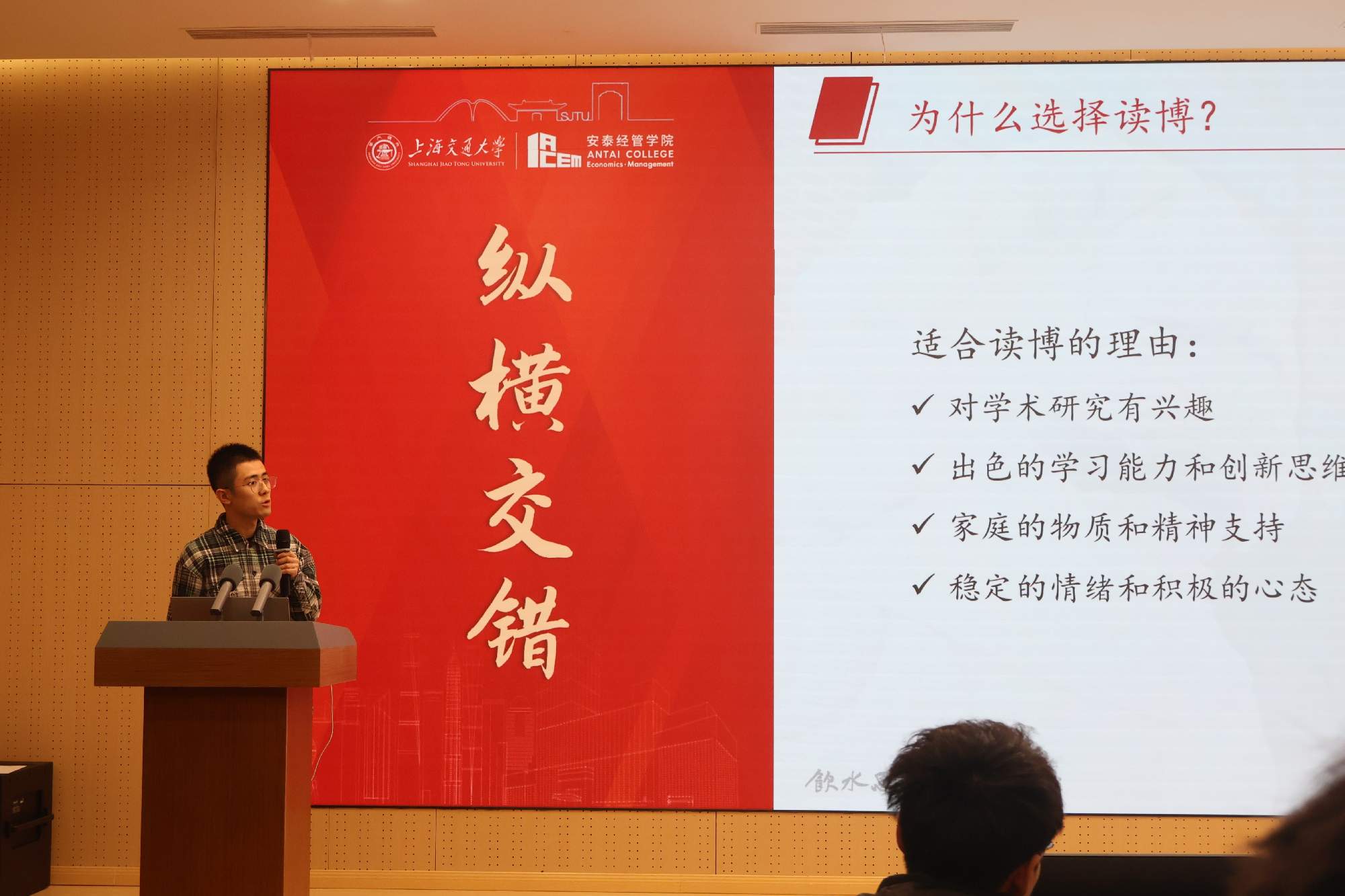 康聪娟和沈刃奇分别为同学们进行了修业指导和安泰硕士项目介绍。康老师详细说明了课程修读要求,并解读了安泰往年推免政策,为同学们提前做好学业规划提供参考。沈老师结合研究方向、特色课程和就业情况等对安泰学术型、专业型硕士项目进行介绍,并对硕士生招生政策进行了详细解读。