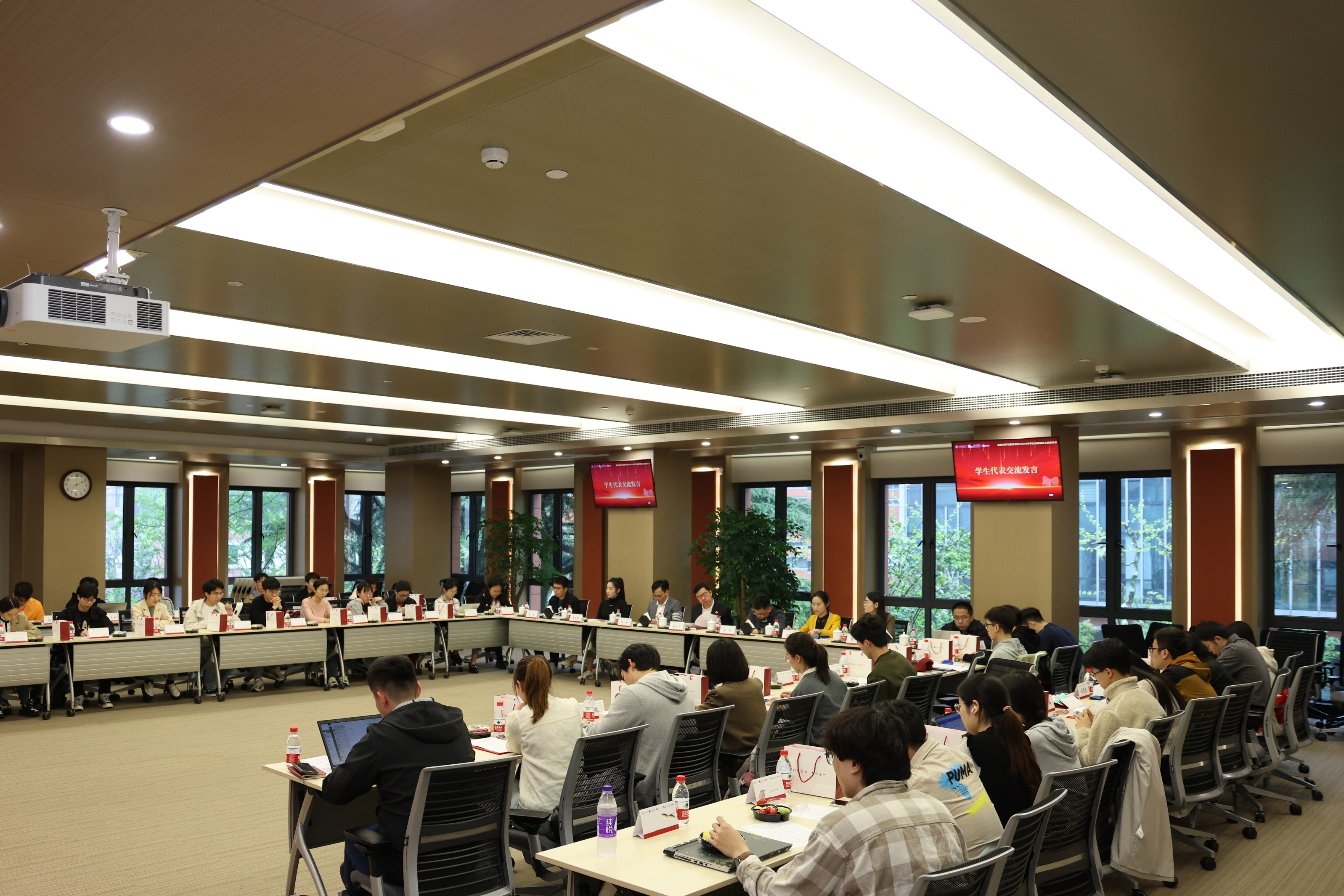 与会同学代表依次交流发言,对校院的资助支持和关心关怀表示感谢,分享了在校期间勤工俭学、锻炼成长的经历感受。赵同学表示,交大的平台充满了机会,能够在不同的赛道上探索,既可以实现技能的提升,又能够认识志同道合的朋友。周同学回顾了自己的军旅生活,表达立志报效祖国、回馈社会的初心。张同学谈及学业实习的实际情况,同时希望有更多的渠道参加志愿公益活动。在场思政教师针对同学们提出的相关问题和建议进行了回应解答。